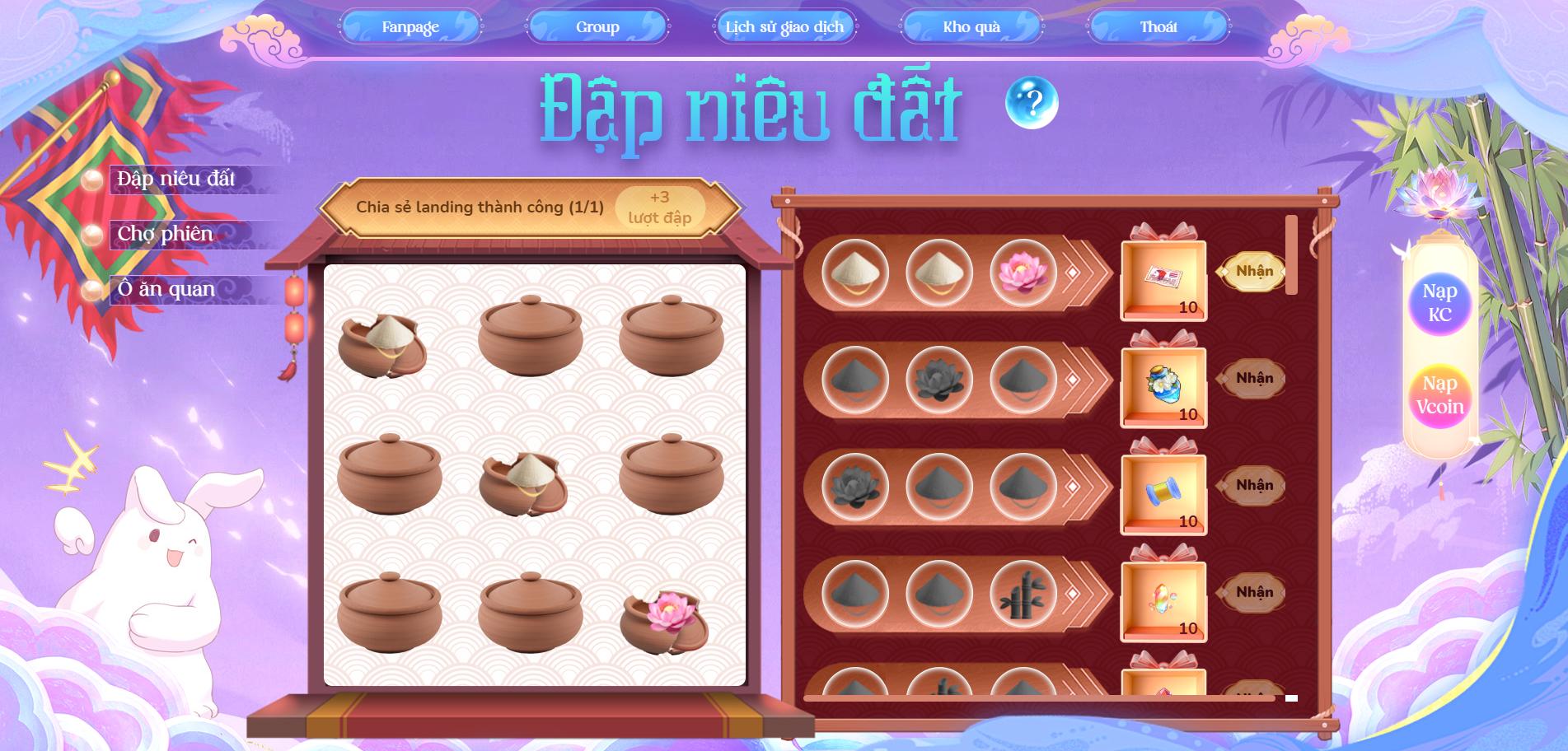+ Mỗi lượt đập sẽ ngẫu nhiên nhận được đạo cụ (nón lá, hoa sen, cây tre)