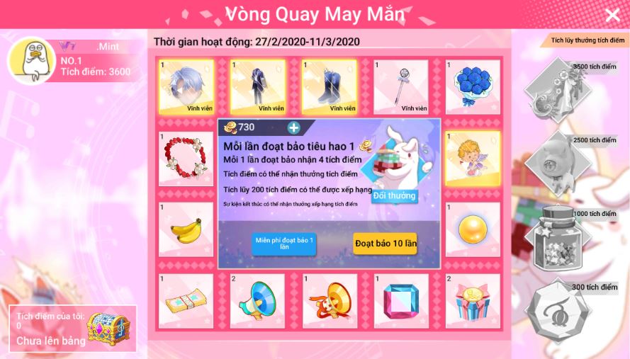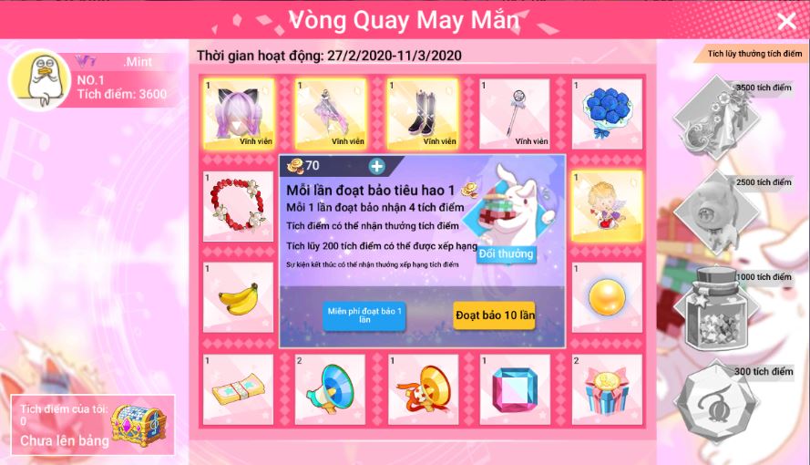 Trong thời gian sự kiện, mỗi ngày sẽ nhận được 1 lượt quay miễn phí (đoạt bảo) tại Vòng Quay May Mắn (VQMM)