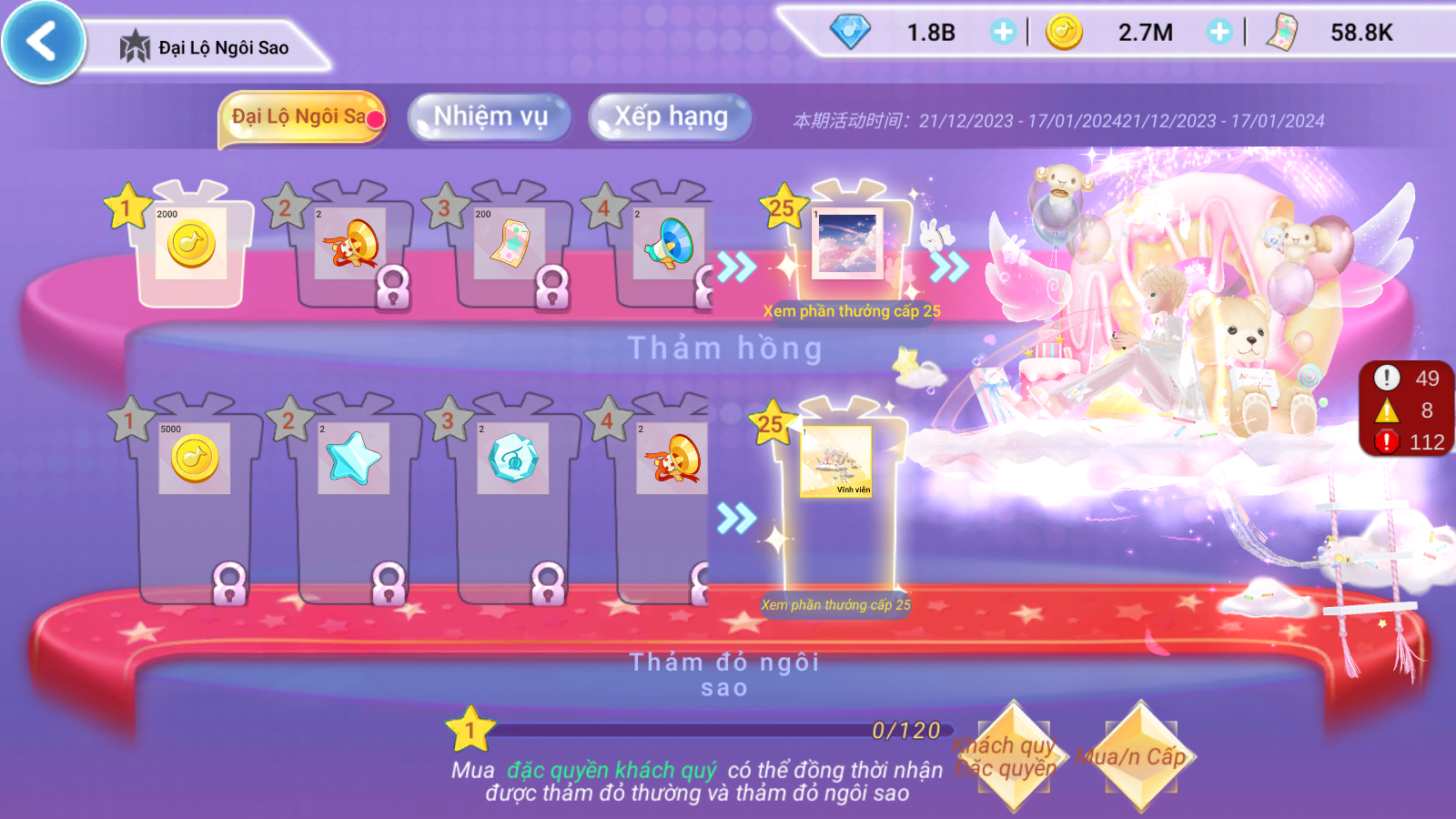 - Gói VIP Hoàng Gia: Lập tức mở khóa phần thưởng thảm đỏ ngôi sao. Cấp độ ngôi sao +15.