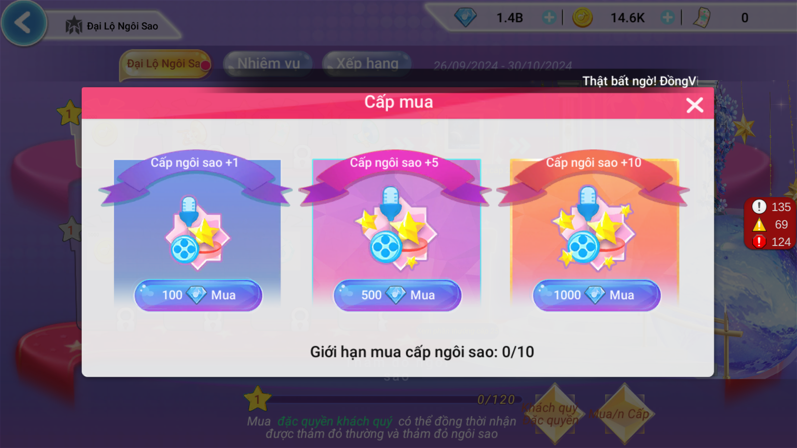 Để rút gọn thời gian hoàn thành nhiệm vụ, các vũ công có thể lựa chọn Mua Cấp Ngôi Sao bằng Kim Cương và nhận quà xịn.