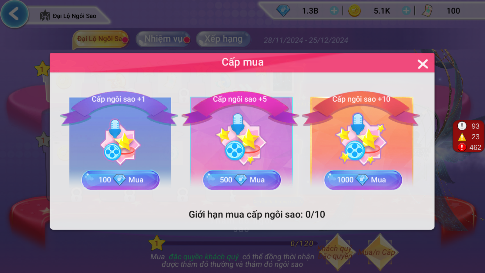 Để rút gọn thời gian hoàn thành nhiệm vụ, các vũ công có thể lựa chọn Mua Cấp Ngôi Sao bằng Kim Cương và nhận quà xịn.
