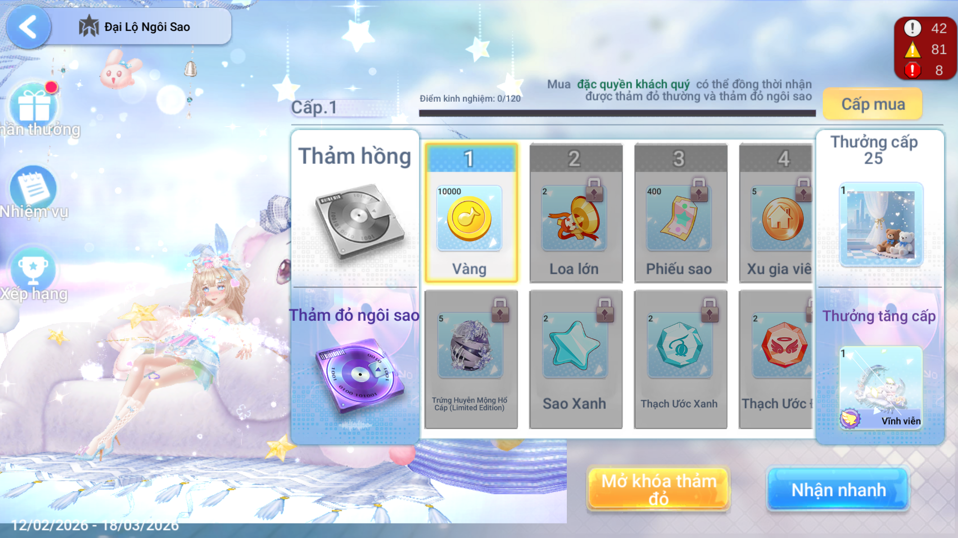 - Gói VIP Hoàng Gia: Lập tức mở khóa phần thưởng thảm đỏ ngôi sao. Cấp độ ngôi sao +15.