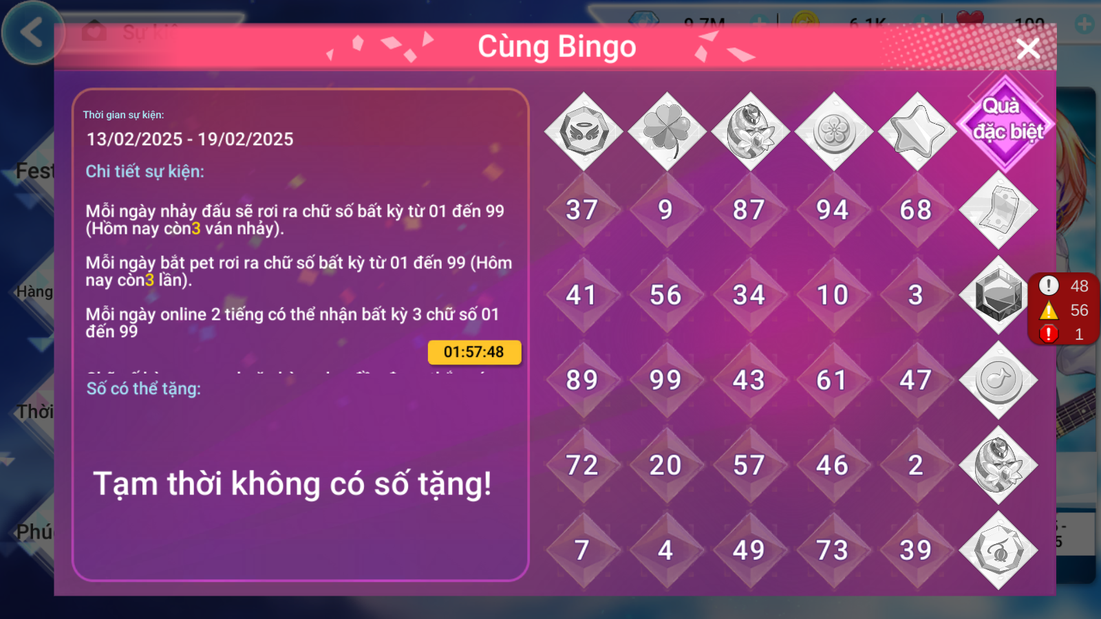 Sự kiện BINGO đã chính thức khởi động, mang đến cơ hội săn quà cực hot dành cho tất cả các vũ công! Hãy thử vận may, hoàn thành bảng số và chinh phục những phần thưởng giá trị nhất. Mỗi ô số là một cơ hội, mỗi hàng hoàn thành là một bất ngờ!