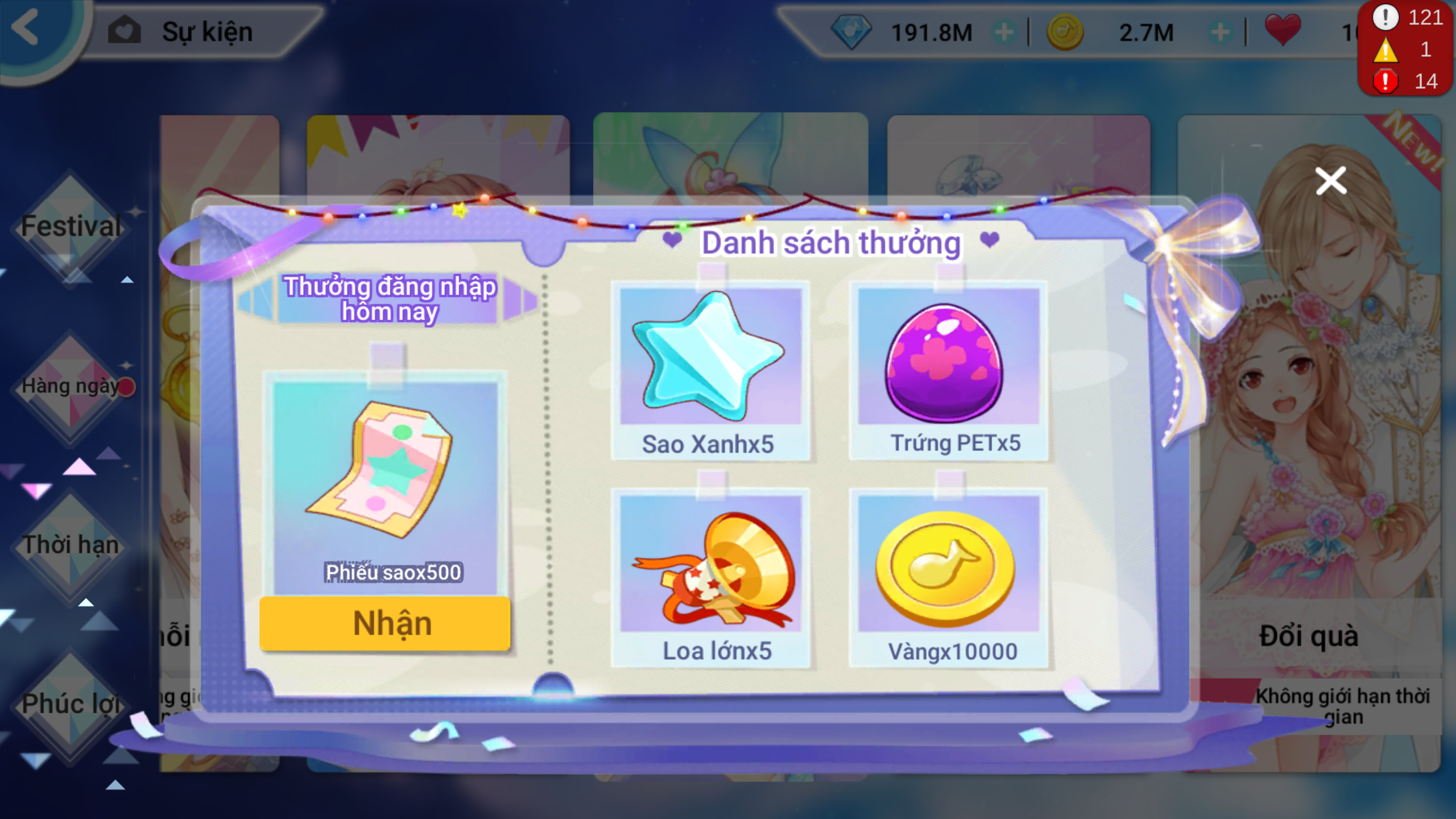 Đăng nhập ngày 7: 500 Phiếu sao/ 01 Trái tim tình yêu/ 05 Thạch Ước Xanh/ 02 Trứng tự chọn