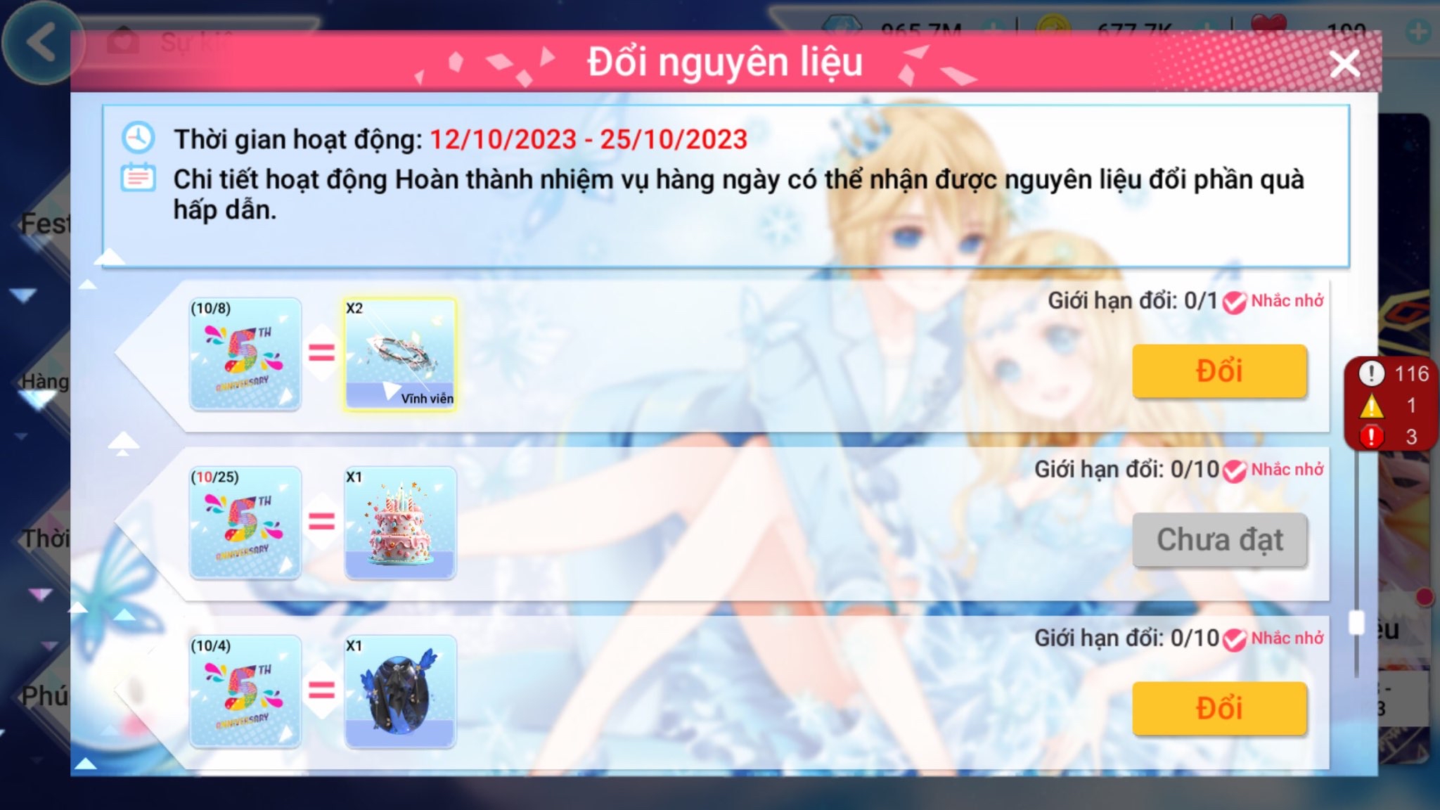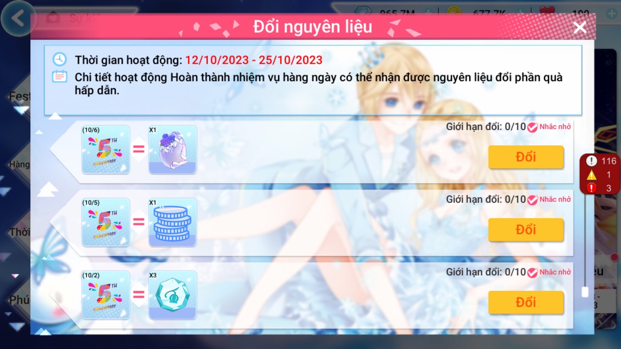 THỂ LỆ: Trong thời gian diễn ra sự kiện người chơi tham gia các hoạt động in-game để thu thập nguyên liệu và sử dụng nguyên liệu để đổi các item thưởng có trong sự kiện.