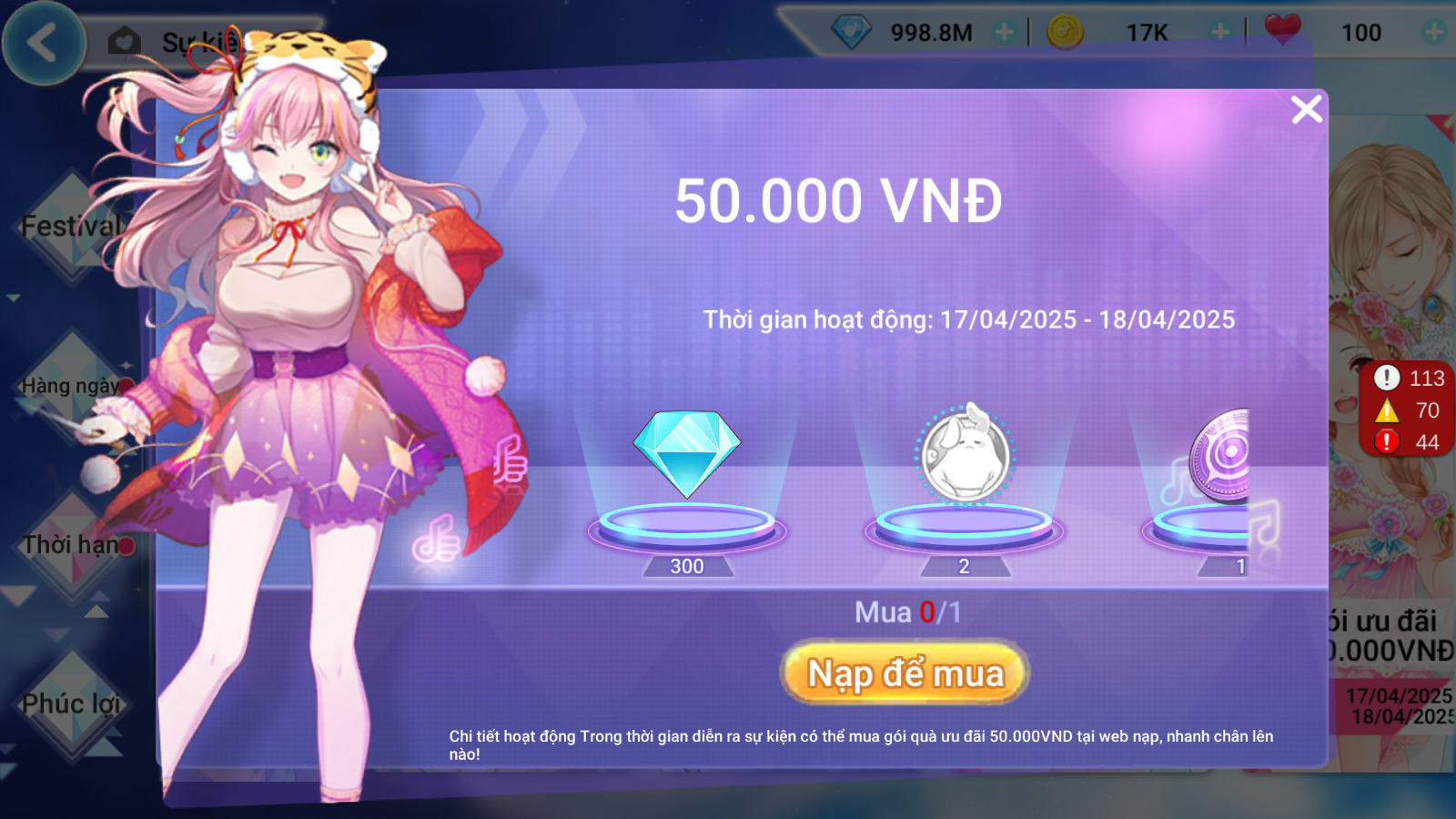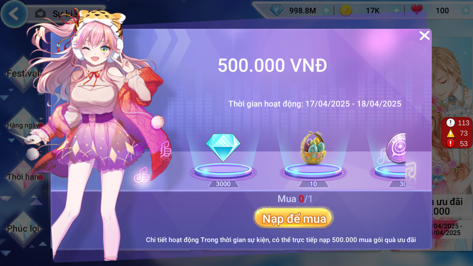 Gói quà ưu đãi 500.000 VNĐ: 3000 Kim Cương + 10 Hộp Quà Kho Báu Thỏ Phục Sinh + 30 Xu Vệt Sao + 01 Hộp Quà Tự PET Tự Chọn