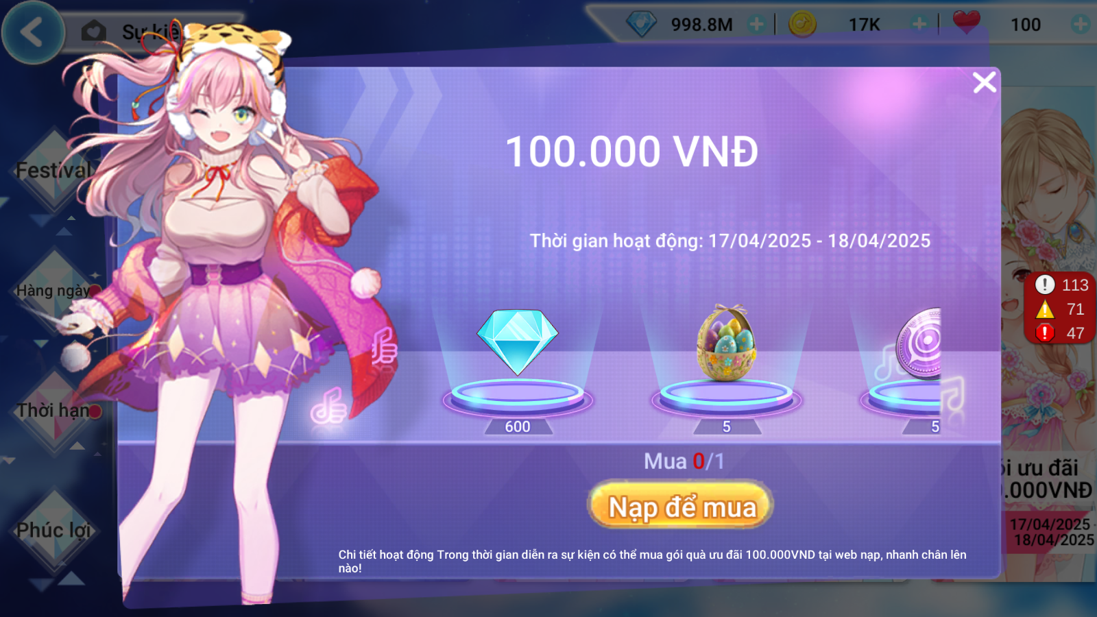 Gói quà ưu đãi 100.000 VNĐ: 600 Kim Cương + 05 Hộp Quà Kho Báu Thỏ Phục Sinh + 05 Xu Vệt Sao