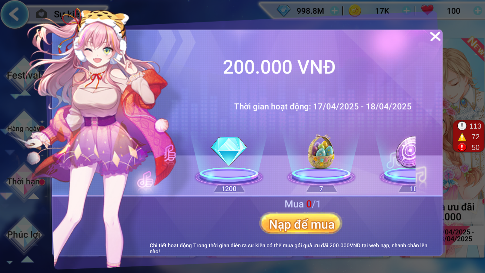 THỂ LỆ: Người chơi nạp các mốc thẻ 50.000, 100.000, 200.000, 500.000 sẽ nhận được các gói quà phần thưởng tương ứng.