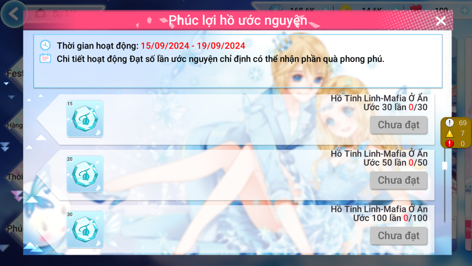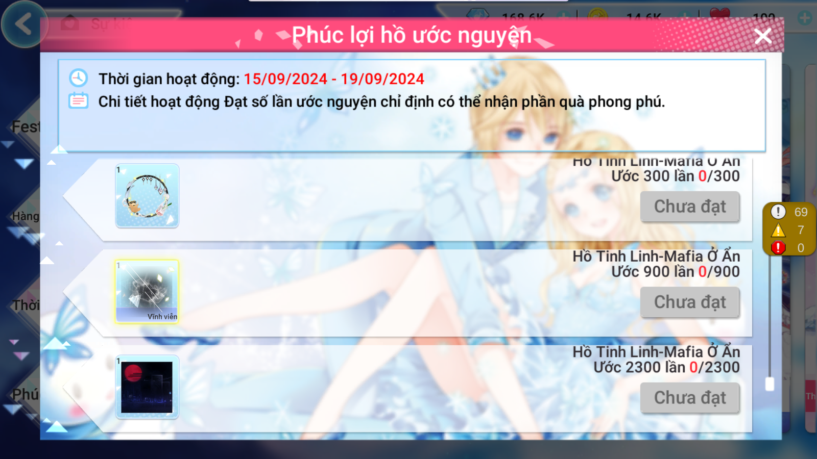 Sự kiện HỒ ƯỚC NGUYỆN chào mừng các vũ công yêu quý tới tham gia. Từ ngày 15/9 đến 19/9, hồ mở thêm ưu đãi khi tham gia cầu nguyện, gia tăng cơ hội nhận được những item trong bộ sưu tập thời trang độc đáo MAFIA Ở ẨN.