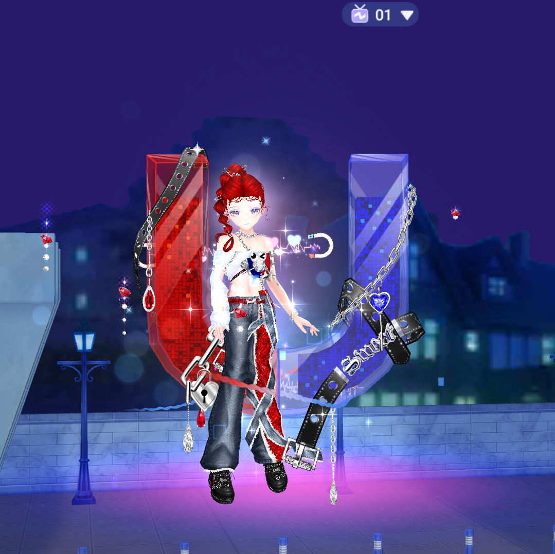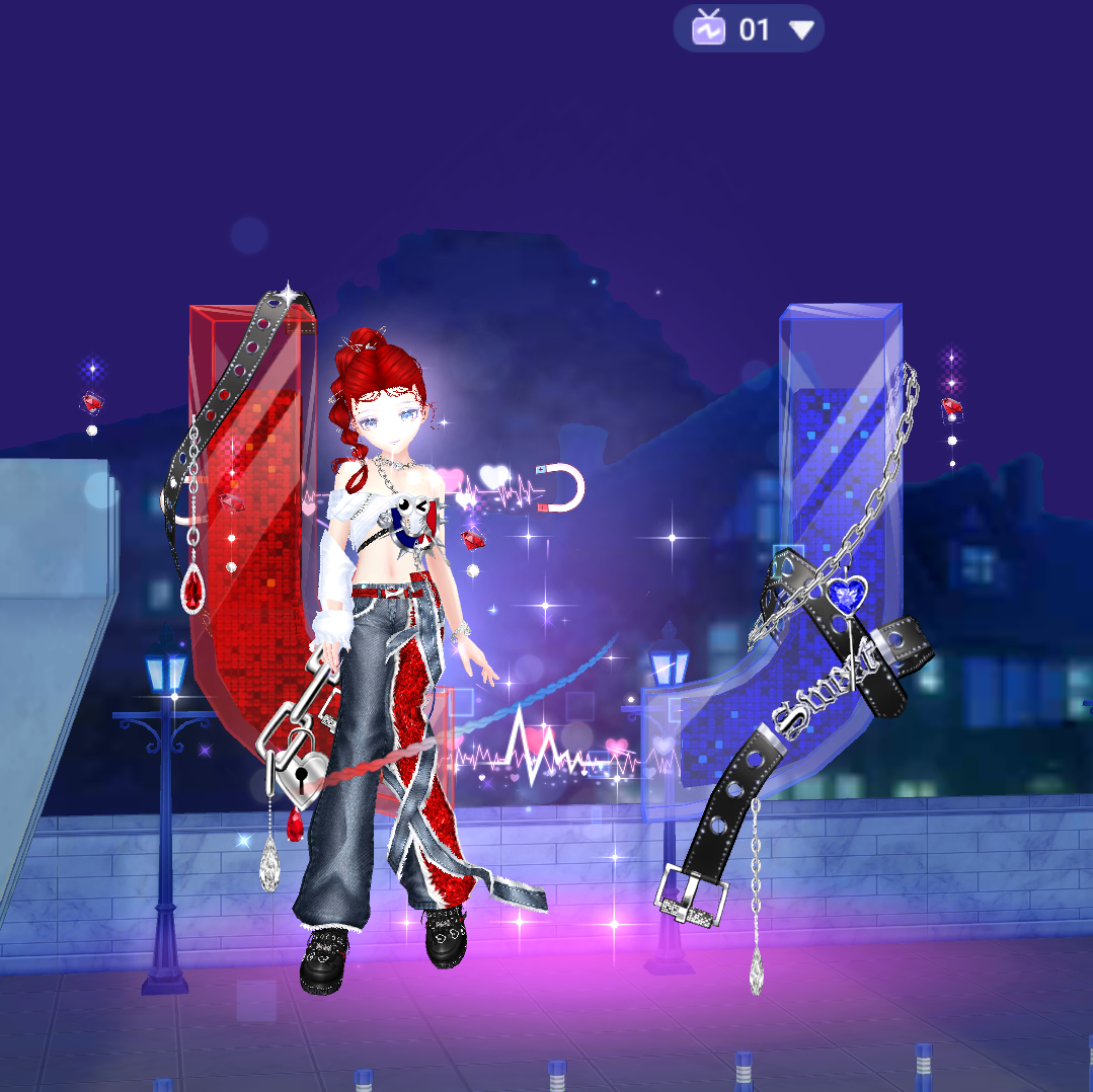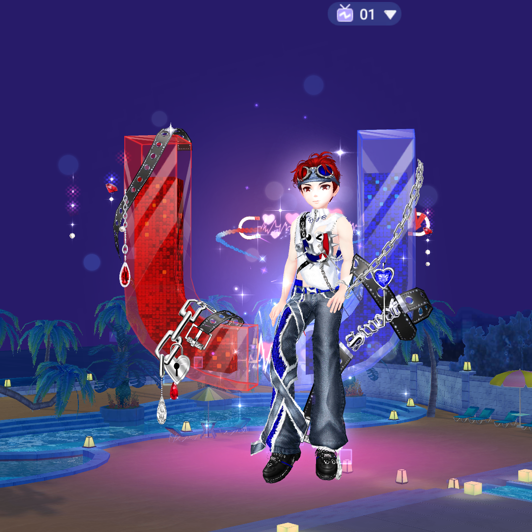 Bộ trang phục này mang phong cách đường phố đầy cá tính. Thiết kế quần jeans rách phá cách kết hợp cùng dây đai, áo khoác không đối xứng, phụ kiện sặc sỡ mang đến vẻ ngoài nổi bật và phá cách. Tone màu xanh – đỏ không chỉ tôn lên phong cách unisex mà còn tạo điểm nhấn đối lập hoàn hảo cho từng nhân vật. Nếu bạn đang tìm kiếm một diện mạo cực “cháy” để khuấy động sàn nhảy, thì đây chính là lựa chọn không thể bỏ lỡ!