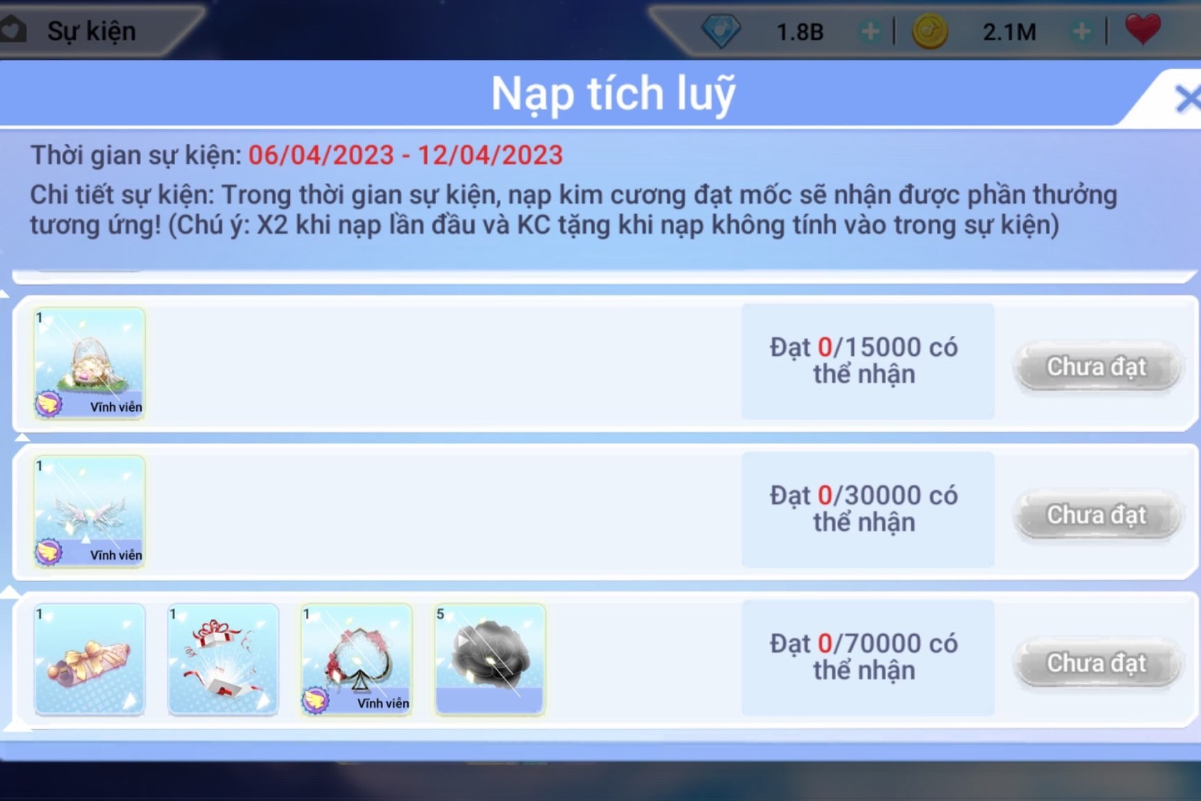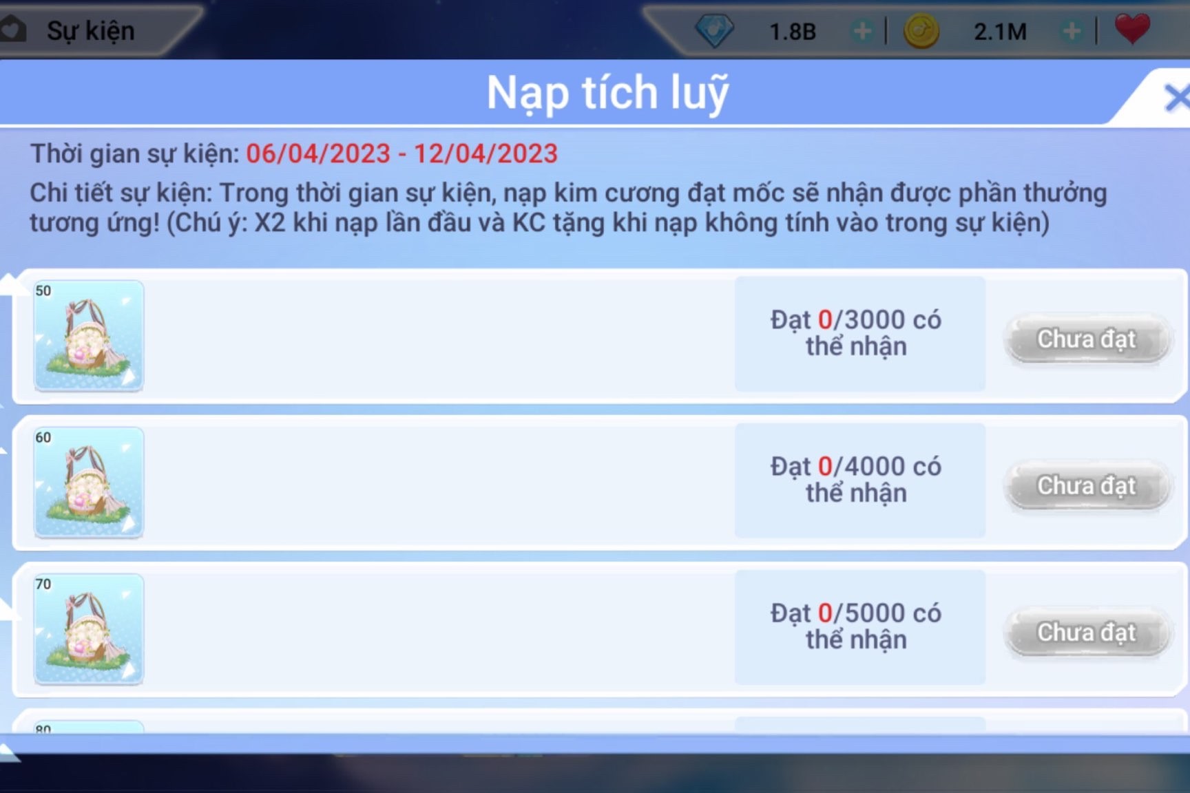 THỂ LỆ: Người chơi tích lũy nạp trong thời gian diễn ra sự kiện, khi đạt mốc nhận thưởng tương ứng.