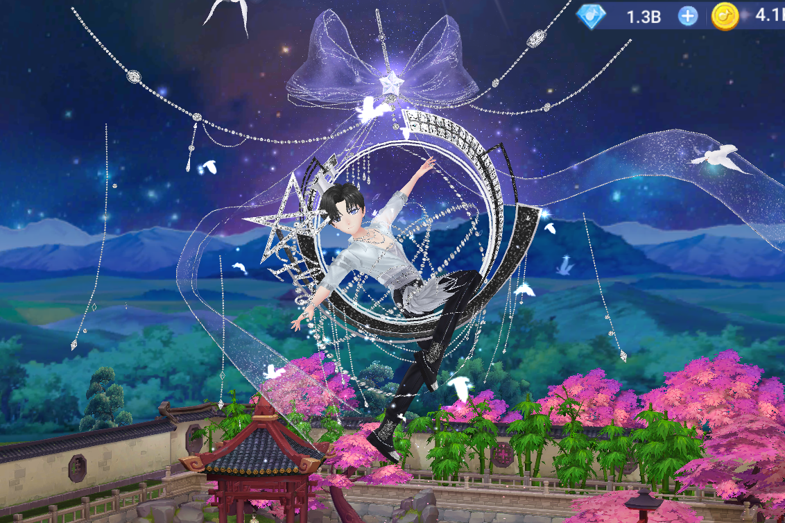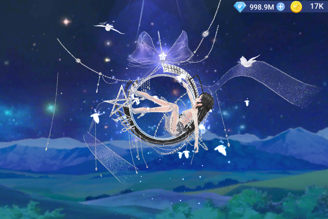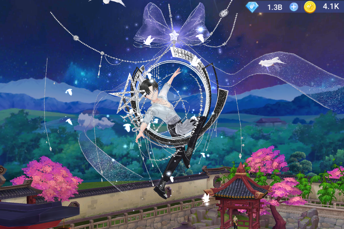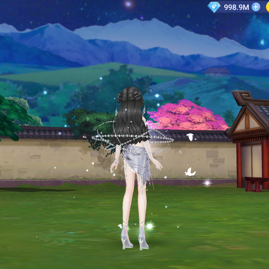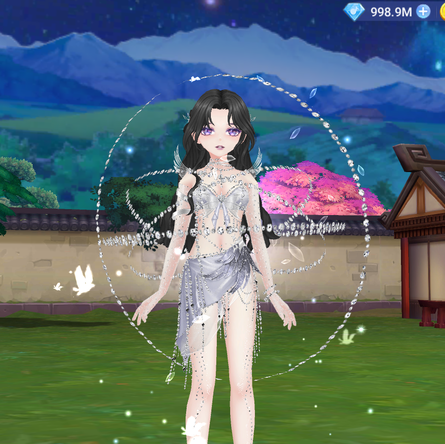 Bộ trang phục lấp lánh như ánh sao, với những chi tiết trang sức đính kết tinh xảo. Lớp vải xuyên thấu nhẹ nhàng kết hợp với tông màu bạc chủ đạo mang đến vẻ đẹp kiêu sa và đầy quyến rũ. Phần phụ kiện cánh bạc tinh tế càng tôn lên nét yêu kiều của người mặc.