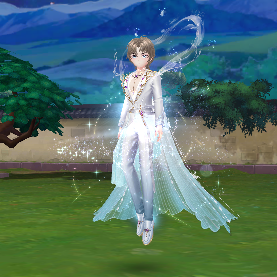 Phiên bản Nam: Bộ lễ phục băng lam với những lớp vải mỏng như sương đêm. Áo choàng rũ dài đính châu sa và kim tuyến, chi tiết vai áo là những nhành hoa tuyết bạc tinh xảo. Mái tóc nâu nhạt cùng vòng năng lượng trắng như khói giúp hoàn thiện diện mạo quý tộc và kỳ ảo.