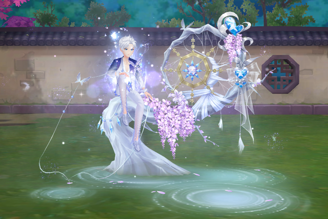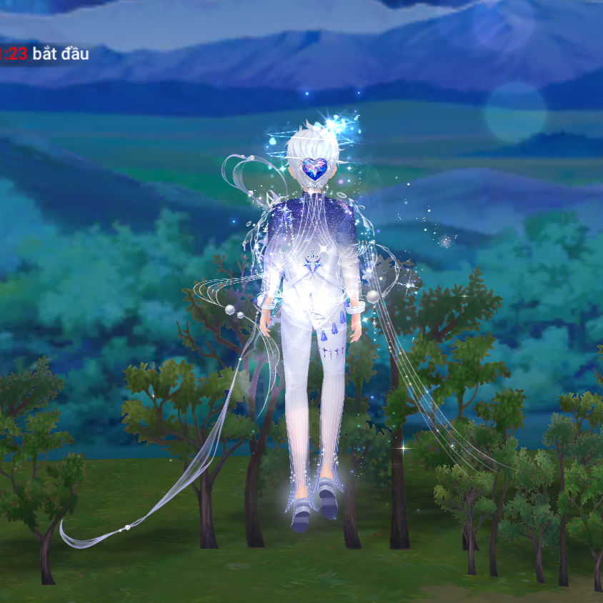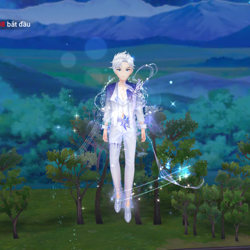 Bộ trang phục sở hữu tông màu trắng – xanh băng làm chủ đạo, kết hợp chất liệu trong suốt và ánh sáng phát quang dịu nhẹ. Phiên bản nam lịch lãm với suit tinh tế điểm họa tiết ngôi sao phát sáng, trong khi phiên bản nữ mang thiết kế váy dài bồng bềnh, phần tà rũ như sương khói tan giữa không trung. Những dải lụa bay nhẹ quanh cơ thể tạo cảm giác nhân vật đang trôi giữa vũ trụ, vừa thanh khiết vừa cao quý.