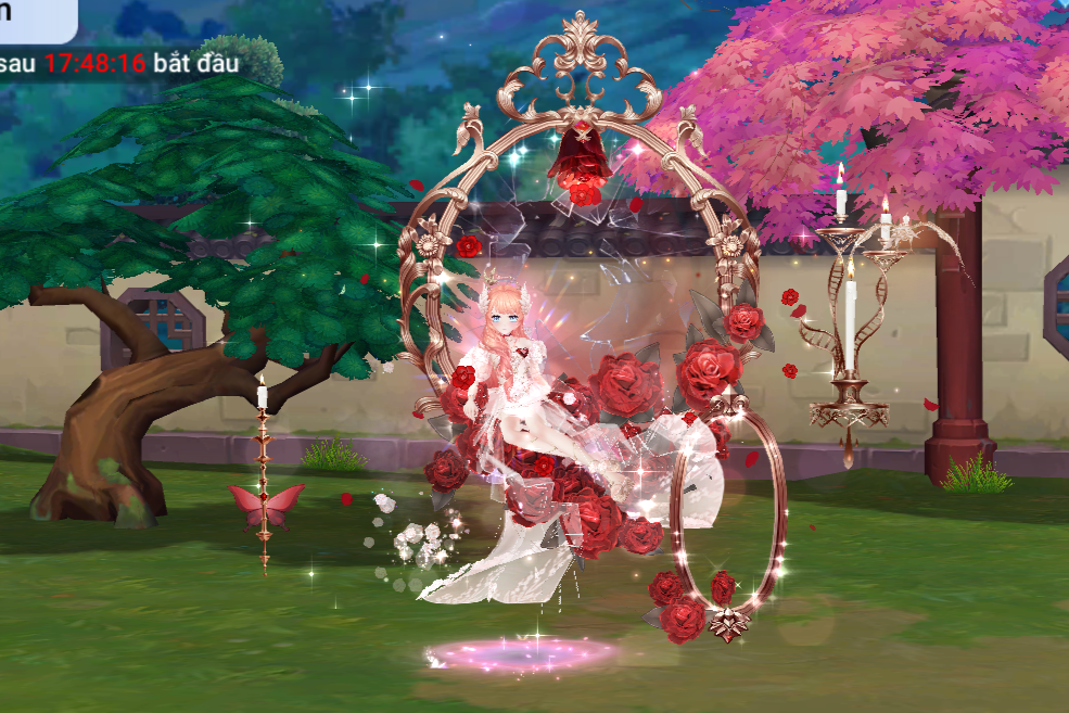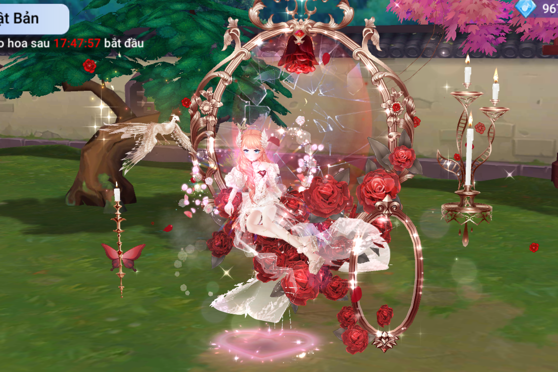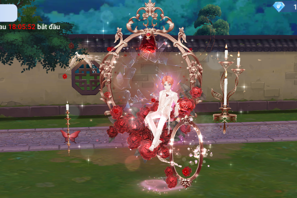 Một trong những item ấn tượng nhất sự kiện chính là chiếc ngai mang hình gương cổ được bao phủ bởi hoa hồng đỏ, ánh nến, và hiệu ứng kính vỡ bí ẩn. Hình ảnh chim bồ câu trắng và dây ruy-băng mềm mại tạo nên tổng thể vừa huyền bí, vừa lãng mạn.