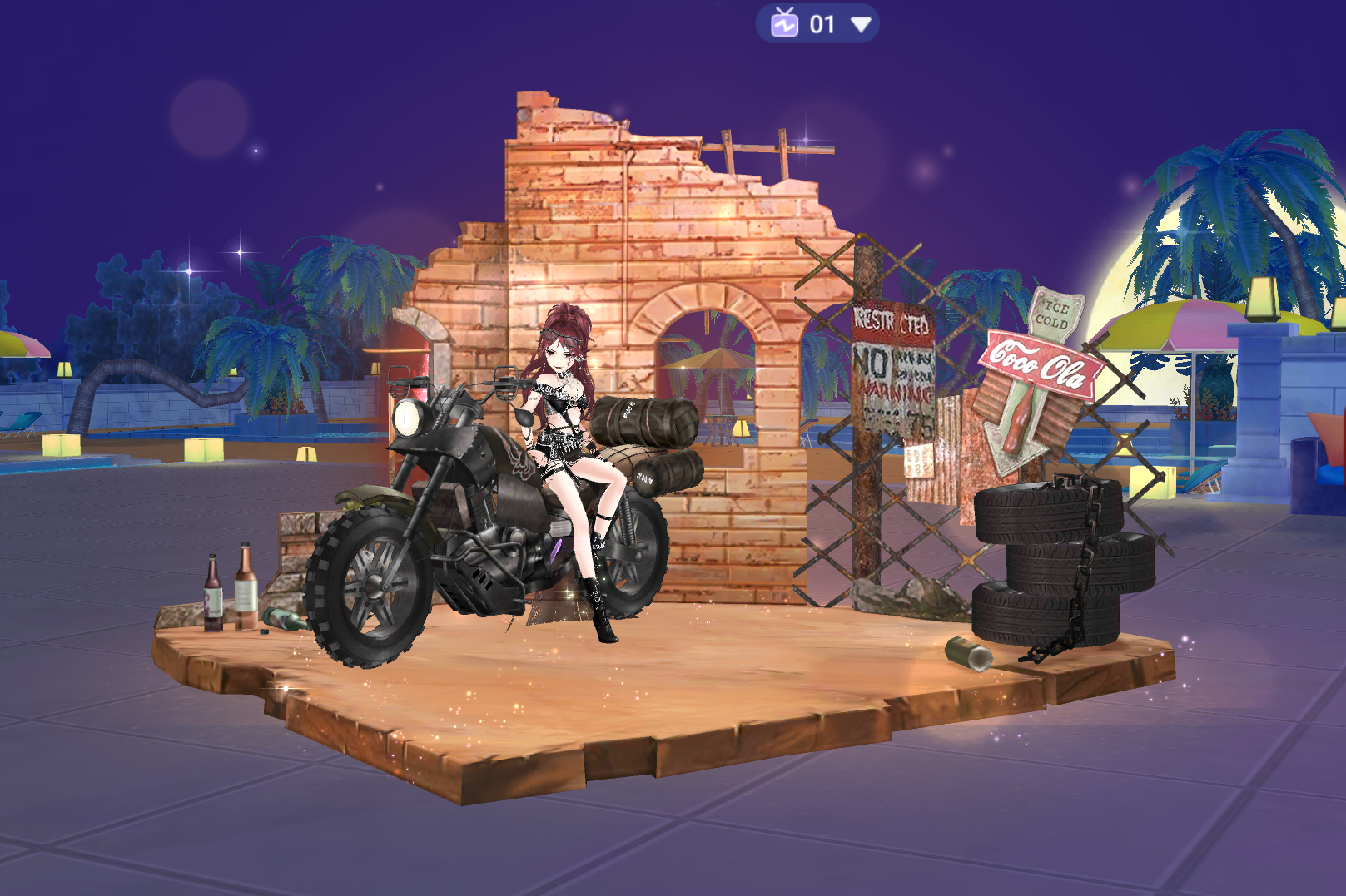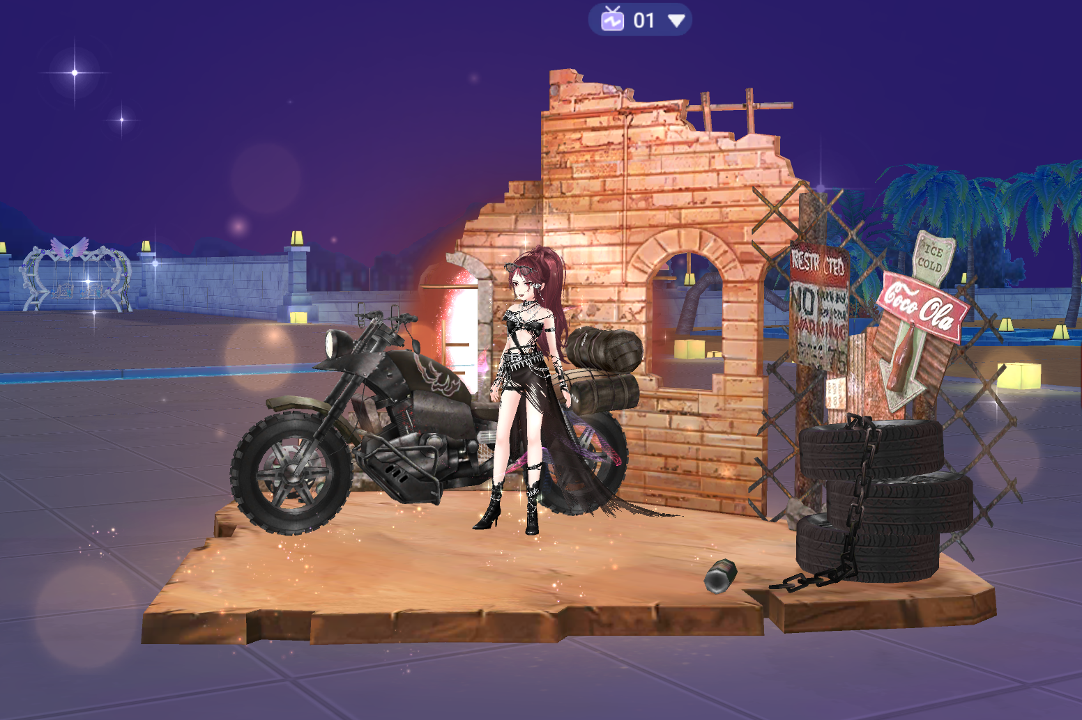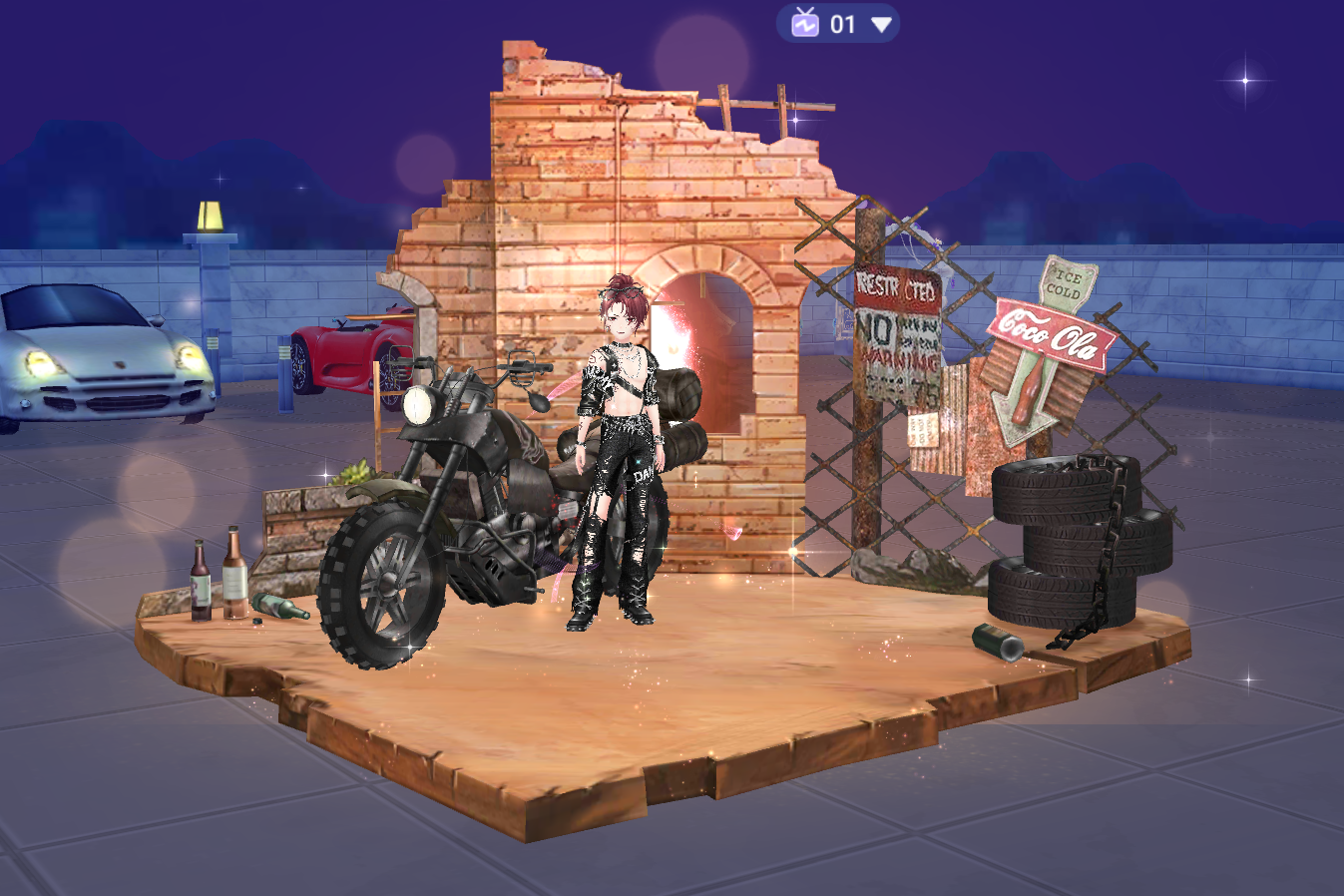 Ngai Đại Ca Băng Đảng chính là bối cảnh “đại bản doanh” của thủ lĩnh, được dựng theo concept khu vực cấm với tường gạch đổ, bảng cảnh báo rỉ sét và hàng lốp xe cũ xếp chồng. Ở trung tâm là chiếc mô tô phân khối lớn, nơi các vũ công ngồi pose dáng đầy tự tin như chuẩn bị bắt đầu một phi vụ tối mật. Hiệu ứng ánh sáng, bụi bay và khung cảnh đêm càng khiến chiếc ngai trở thành vật phẩm điểm nhấn, thể hiện vị thế tối thượng của người sở hữu. Đây là item mang tính biểu tượng, chỉ dành cho những ai thật sự muốn khẳng định bản lĩnh “anh đại – chị đại” của mình.